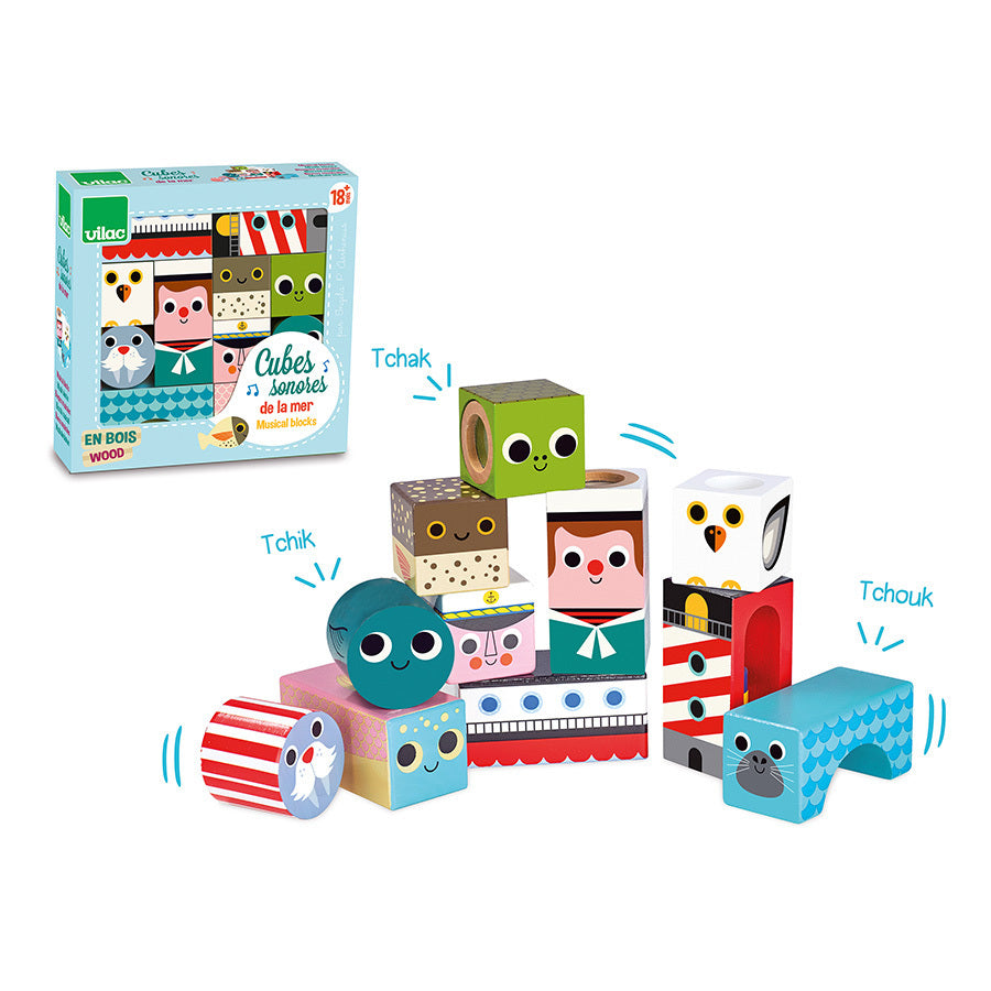 DESCRIPTION : prêt à embarquer sur la mer avec une baleine qui fait tchik et un marin qui fait tchouk ? Dans ces jolis cubes en bois décorés par Ingela Arrhenius, pas de pile ! Les bruits tout doux sont obtenus grâce à des billes, des grelots, du sable et des perles enfermées à l’intérieur des cubes !